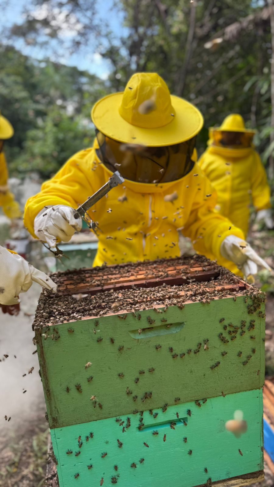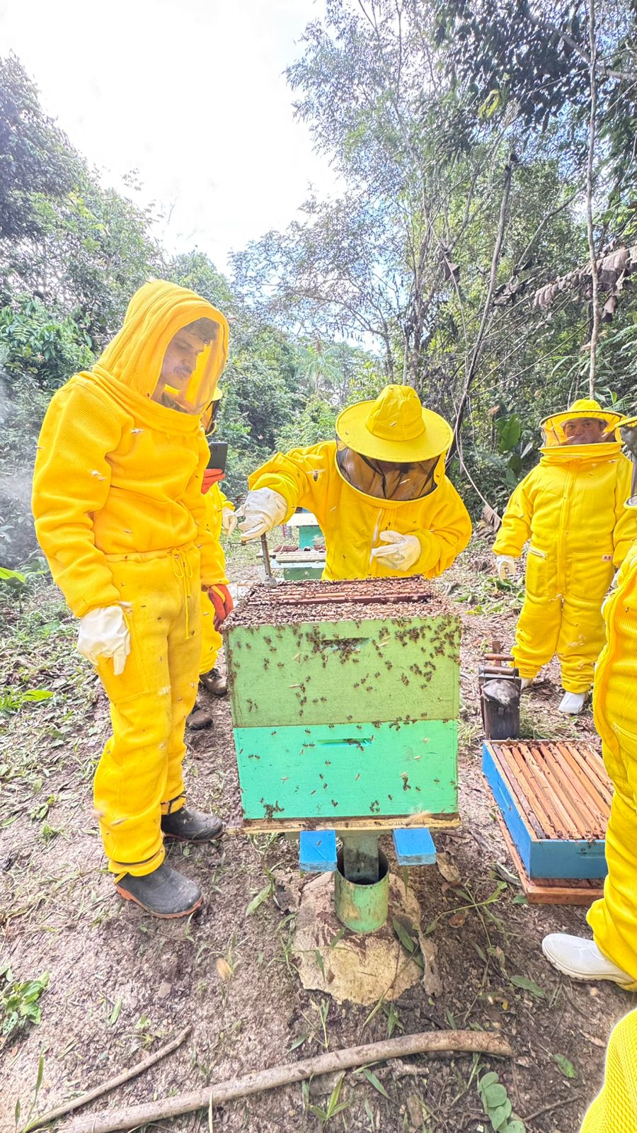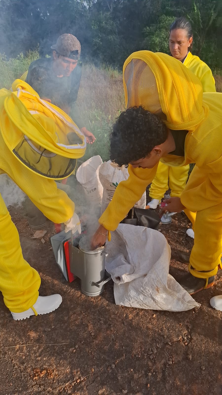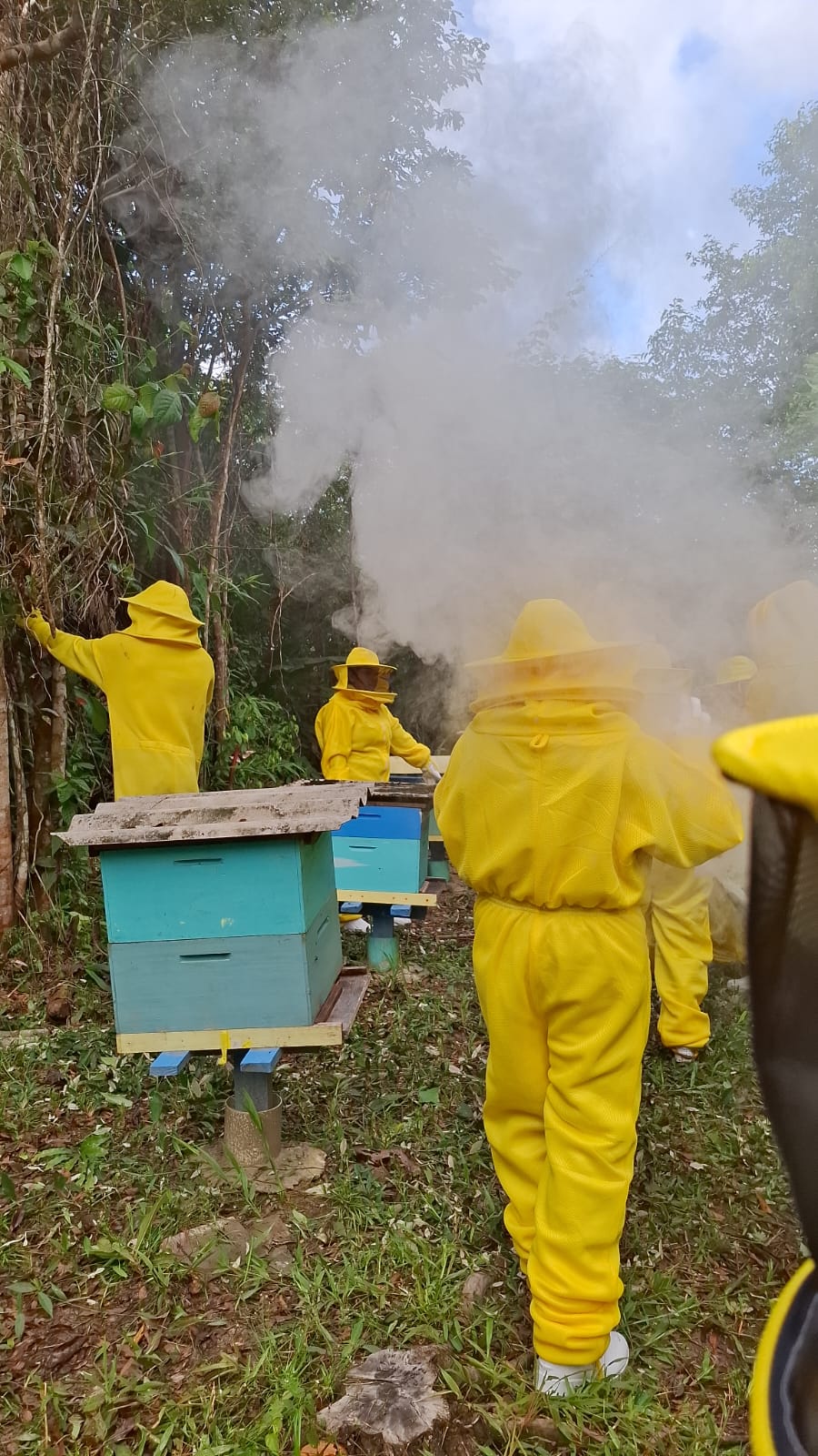 A atividade incluiu a observação direta de uma colmeia da espécie Apis mellifera, com a identificação de seus elementos internos, além da prática do manejo das abelhas com o uso correto dos Equipamentos de Proteção Individual (EPIs), como roupas especiais, luvas e máscaras de proteção.