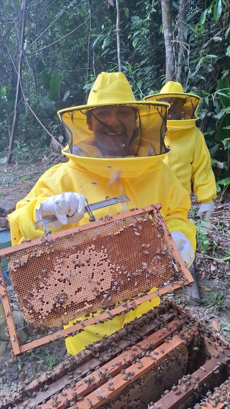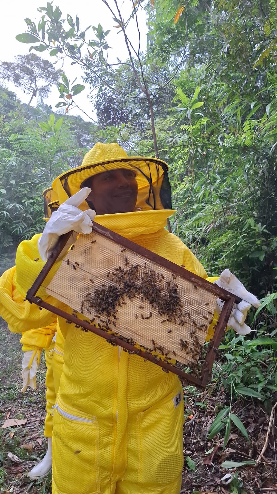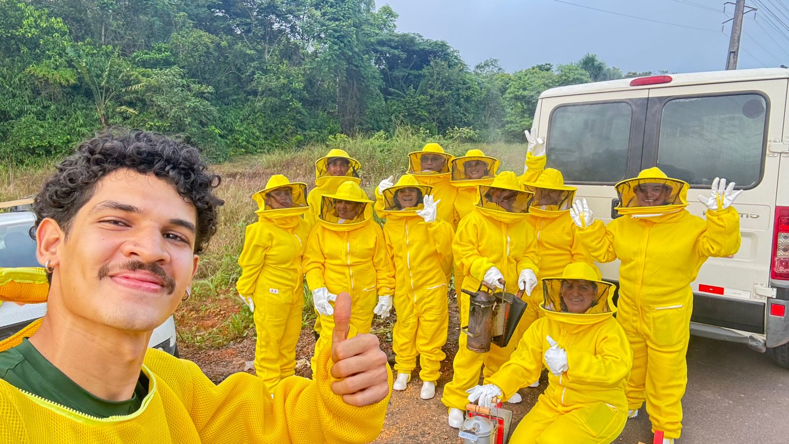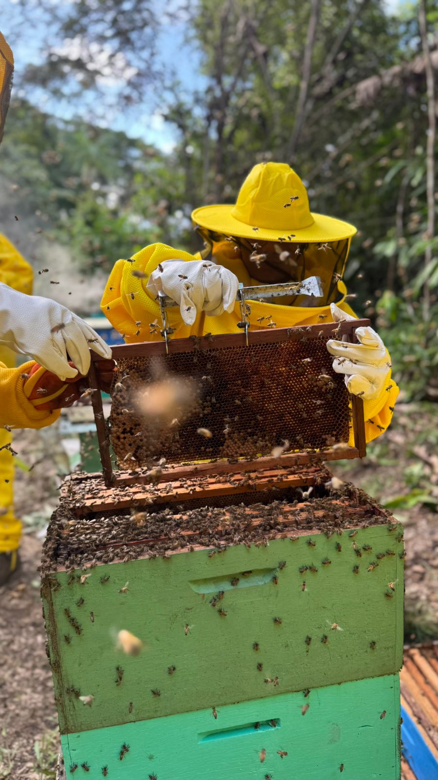 A atividade incluiu a observação direta de uma colmeia da espécie Apis mellifera, com a identificação de seus elementos internos, além da prática do manejo das abelhas com o uso correto dos Equipamentos de Proteção Individual (EPIs), como roupas especiais, luvas e máscaras de proteção.