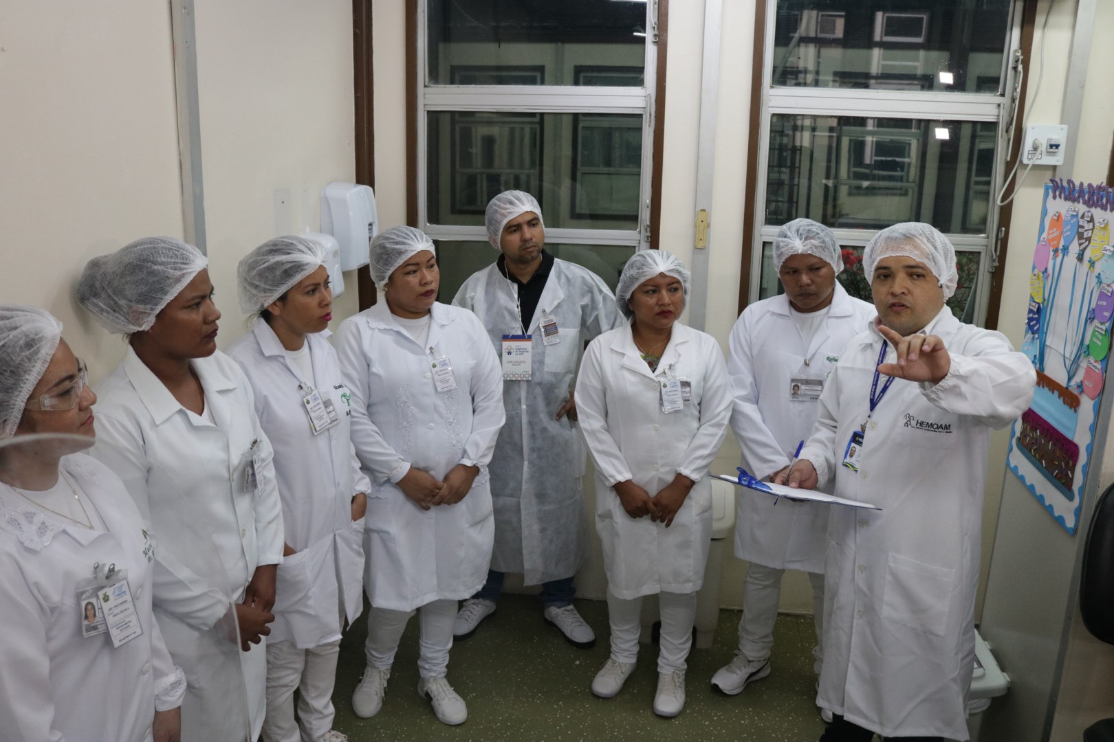 A turma realizou visita técnica às dependências da Fundação de Hemoterapia e Hematologia do Amazonas (FHemoam) e, atenta, não perdeu nenhuma explicação do professor Theomário Theotônio, subgerente do Centro de Processamento Celular da instituição. Ele recepcionou os alunos e ensinou, na prática, o que eles já sabem, na teoria, a respeito de Imunologia.